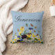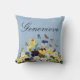 Customisable elegant Boho throw pillow with pretty colourful girlie spring pansies, daffodils and butterflies on a vintage pale blue Victorian background.