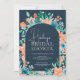 Boho fall autumn floral watercolor bridal shower invitation on white, with a boho fall autumn hand painted earth tone flowers in dusty blue, terracotta, sage green, burnt orange, with roses and peonies and greenery on dark navy blue background.