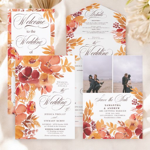 Boho fall floral calligraphy chic rsvp wedding invitation