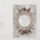 Invite your guests to a celebration of bohemian romance and natural elegance with this exquisite wedding invitation. The design features a stunning central white circular frame encircled by a lavish wreath. This wreath is composed of soft, layered beige and brown feathers, delicate pale pink daisy-like flowers, and intricate sprigs of white and copper-toned foliage. The frame itself is highlighted by delicate gold inner detailing that suggests antique craftsmanship, all set against a subtle, textured gray and white backdrop. This aesthetic beautifully blends earthy, organic elements with classic, opulent accents, perfectly setting the stage for a unique, stylish, or desert-themed wedding. This invitation card is ideally suited for a bohemian style wedding, a chic engagement celebration, or an outdoor reception. It would also perfectly suit a sophisticated fall or desert-themed party or a serene, elegant vow renewal ceremony. The card's captivating blend of pristine florals and a moody, monochromatic backdrop ensures it is versatile for any solemn ceremony, corporate gala, or refined birthday announcement.