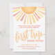Celebrate your little one's First Trip Around the Sun with this bright and cheerful 1st birthday party invitation. At the top, "First Trip" is highlighted in bold script calligraphy, setting the tone for a joyful celebration. A big sun with vibrant rays in classic shades of yellow, orange, and a touch of red beams down, creating a warm and sunny theme. The bottom of the invitation includes all the event details, styled in a mix of modern fonts and bold script typography, with colours that match the sun's classic rays.