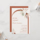 Bohemian Floral Arch Bridal Shower Invitation. Boho style watercolor flowers, pampas grass and delicate green foliage frame on beige and terracotta orange backgrounds.