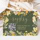 Fall in love boho floral autumn chic registry bridal shower featuring pretty green, yellow, mustard and khaki flowers frame with foliage and eucalyptus. A boho inspired fall autumn bridal shower theme with a modern heart script typography and a pretty floral pattern on the back on dark green