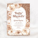 Boho baby shower invitation in trendy earthy mocha colour. Beautiful elegant modern design with hand painted botanical accents. Features delicate watercolor roses, peonies, pampas grass and retro typography font. You can choose printed invitations and/or instant download digital template. Personalise with your own details. Perfect for a stylish gender neutral boho baby shower celebration.