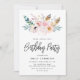 Stylish birthday party invitation featuring a boho watercolor floral bouquet with feather accents. Personalise the invitation with your birthday party details below.