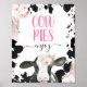 Cute cow themed birthday party sign for a baby girl featuring a cute black and white cow, a bold cow print pattern and some lovely pink floral arrangements with some pampas grass. This cow birthday sign is a cute addition for a cow themed girl's first birthday party.