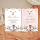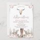 Sweet western or rodeo themed bridal shower invitation featuring a bull or cow skull, cowgirl boot, some floral arrangements with pampas grass and cactus.