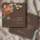 Modern whimsical boho floral business cards with earthy brown and green floral elements and leaves on a cocoa brown faux linen background. Add your contact information and social media to the back of the card, on a contrasting black background that makes the earthy colours pop.