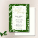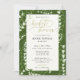 Branches of llily of the valley spring flowers, hand-painted in watercolor and graphite, decorate this elegant, modern, simple and sophisticated boho spring or summer bridal shower invitation template that features a green background, modern calligraphy with ample flourishes and gold in the colour of the title. This art drawing invitation would be a lovely choice for couples who love black, white and gold, art drawings and modern minimalist designs with a touch of updated formal and traditional.