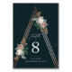 A boho floral table number card featuring beautiful rose gold pyramid structure with asymmetrical vintage rose botanicals.