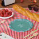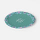 Bold bridal shower paper plates with retro bohemian style floral mandala motif pattern in teal green, aqua blue, and pink violet purple.