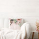 This lovely, feminine decorator pillow has a boho flair with pink and white stripes and large pink flowers with feathers on the front and back.