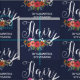 Floral pattern for a hair dresser, hair stylist, or barber in navy blue with Hair written in a charming script, a white pair of scissors, your name, and a pretty floral bouquet with flowers in pink, orange, white, and coral red.