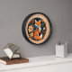 The size of the clock is dramatic and the abstract alcohol ink design is soothing and intricate at the same time. I chose the black frame that adds pop to the blue and gold design. The gold printing would be better in a slightly darker or larger font. I love it and I’m looking for just the right place in ny new apartment. I would recommend this clock for a personal gift or a present. I feel that the quality is excellent for the money! I’m a bit of a clock nut so I’m pretty particular about my purchases. The clock is larger in diameter than many if the clocks I have, so it stands out very well. I think a slightly darker printing color and a moderately larger size would best suit a professional decor or add more impact in a work place item.