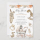 A cute boho gender neutral baby shower invitation featuring a collection of baby goods, baby toys, clothes and baby stroller. Earthy hues of cream, brown and peach.