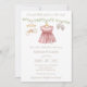 A sweet minimalistic baby shower invitation for a girl. A pretty in pink dress, boho mobile, and booties hung on a eucalyptus clothesline.