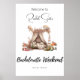 This Bachelorette Party Weekend welcome sign with a glamping theme exudes an air of romance and adventure, inviting guests to a memorable outdoor getaway. The design is both elegant and whimsical, with careful attention to detail. The focal point of the invitation is a beautifully illustrated, soft pink bed that takes centre stage. This bed is exquisitely designed with a draped canopy featuring delicate, hand-painted flowers in various shades of pink, creating a dreamy and enchanting atmosphere. The canopy appears to gently billow in the wind, adding a sense of movement and romance to the scene. Above the bed, a scattering of soft pink and gold floating lanterns adds a magical touch. These lanterns seem to hover in the air, casting a warm, inviting glow and symbolising the guiding light of friendship and adventure. They create an ethereal and whimsical ambiance, perfect for a glamping experience under the stars.