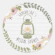 A glamping theme bridal shower sticker featuring an illustration of a green camping lantern at centre surrounded by floral wreath.  Background is grey wood.  Personalise the text.