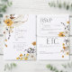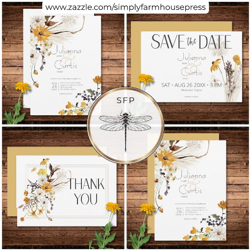 Celebrate your love story bathed in the warm glow of a golden meadow. Our whimsical wedding save the date card features vibrant watercolor bouquets. This suite design features sun-kissed yellow gold, buttery yellow, and golden brown blooms mingle with delicate white daisies, white flowers and elegant yellow lilies. Playful accents of dried thistles and soft beige tan grasses add a touch of rustic charm, while sage green foliage and sprays of black berries offer a touch of whimsy. Playful yet elegant fonts perfectly complement the design, setting a light and joyful tone for your special day. This enchanting suite captures the essence of a summer's end meadow, inviting your guests to share in the joy of your love. Created by Simply Farmhouse Press.