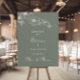 This boho green floral wedding advice and well wishes poster is perfect for a rustic wedding. The design features watercolor apple blossoms and flowers in a green background.