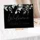 Boho Greenery Black Eucalyptus Wedding Welcome Sign. Stylishly impress your wedding guests with this elegantly designed wedding welcome sign featuring beautiful green eucalyptus leaves on a stunning black background. This wedding welcome sign has a beautiful green foliage design, with rustic and botanical vibes, perfect for your rustic, greenery or eucalyptus-style wedding.