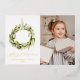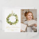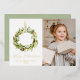 Send your loved ones holiday greetings with our beautiful photo holiday card. The elegant holiday card features a watercolor holiday wreath of pine boughs, pine cones, and green leaves hung with light beige ribbon. The phrase "Merry Christmas" is displayed below in a modern gold foil script. Personalise the front of the Christmas card by adding your name, the year, and a photo. The card reverses to feature your custom message against a sage green background.