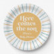 Boho Here comes the Son baby shower party plates in blue and yellow.