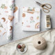 Warm boho-inspired wrapping paper featuring a cozy blend of rattan furniture, leafy plants, rainbows, and soft earthy tones.