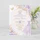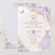 This lovely lavender quinceañera invitation features soft pastel purple roses, an elegant princess ball gown, a sparkly gold tiara & bow tie and tropical boho elements. Click the "customise further" button if you wish to re-arrange and format the style and placement of the text.