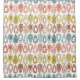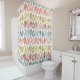 This shower curtain has a Boho design of pointy ovals in Boho shades pf pink, blue, gold, and brown.