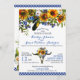 Bohemian floral inspired wedding invitation card design with watercolor longhorn cow skull with feathers, sunflowers, wild flowers and blue gingham check border.