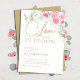An elegant and modern "Love is in Bloom" bridal shower invitation featuring a lush bouquet of watercolor roses, orchids, eucalyptus and some other gold foliage (not real gold, this is a digital effect), as well as modern calligraphy.