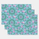 Bold retro bohemian style floral mandala motif pattern in teal green, aqua blue, and pink violet purple.