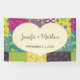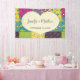 Create a custom banner to use for signage or a backdrop at your wedding. This banner features a cream coloured heart shape graphic with faux stitching accents that's ready to be customised with the names of the bride and groom and their wedding date. The heart is set against a colourful patchwork quilt style background.