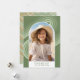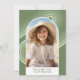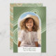 A modern Merry Christmas photo card in shades of pastel gold and green. Curvy retro lines surround the photo in shades of pastel. The front photo is a mod arch with a white border. The back includes 2 more photos. The background for the back is a boho coloured herringbone pattern - an eclectic mix of patterns.