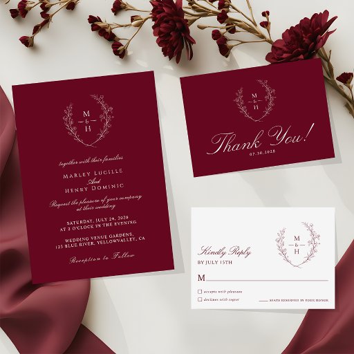 This monogram wedding dinner menu features a rich burgundy background with refined boho botanical wreath. A classic monogram adds a formal touch, while the clean layout presents the menu clearly. The design feels warm, stylish, and easy to read.