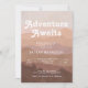 A trendy boho baby shower invitation featuring a pink mountains and forest background overlaid with white retro font and the editable headline "Adventure Awaits"
