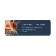 A simple boho return address label for your wedding invitations. The simple design features a watercolor floral in shades of rust, terracotta and beige on a navy blue background.