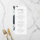 This trendy and elegant wedding menu features boho navy blue watercolor peony flowers with lush leaves, berries, and feathers on the back. The front of the menu features stylish matching modern typography.