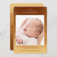 Elegant modern watercolor bohemian style birth announcement design with abstract neutral orange yellow and brown tone detailing. Script introducing line, and modern clean sans serif typography fonts. Space on the front for a large single photo along with birth statistics including birth date and time, as well as a baby's weight, length, and short line with parents' names. Back side features two additional photo spaces.