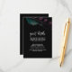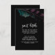 Romantic boho chic wedding guest details card features a colourful feather and black background.