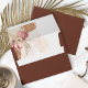 Bring the warmth of the kasbah to your wedding with this desert inspired wedding collection that features a colour palette from soft sand and rose gold to deep burnt umber. Exotic dried botanicals, subtle arch shapes and ethereal watercolor backgrounds add to the mystique. The coordinating envelope design shown here has a watercolor botanical interior and optional burnt umber exterior. Search ID959 to see coordinating pieces for this beautiful wedding collection.