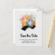 Save the date postcard with a watercolor illustration of an orange camera with a floral bouquet and a black and white wavy film strip.