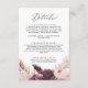 This boho pampas grass details enclosure card is perfect for a summer wedding. The floral watercolor design features bohemian burgundy and blush pink flowers with sprigs of neutral pampas grass and golden dried palm leaves.