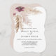 This boho pampas grass wedding invitation is perfect for a tropical wedding. The floral watercolor design features bohemian burgundy and blush pink flowers with sprigs of neutral pampas grass and golden dried palm leaves.