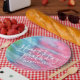 Tie-dye design on personalised paper plates for a birthday party, featuring a unique cloth texture for an authentic boho shirt colouring theme, in trendy pink and aqua colour scheme. Visit the Paper Grape Zazzle Designer shop for coordinating tiedye party decor.