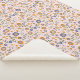 This image is a seamless pattern featuring a vibrant boho floral design. The pattern is composed of various stylised flowers in shades of blue, yellow, and orange, interspersed with leaves and small dots. The background is a simple white, allowing the colourful flowers to stand out. The overall aesthetic is cheerful and playful. The intricate details of the floral elements create a sense of depth and texture, adding visual interest. The use of contrasting colours adds vibrancy and makes the pattern visually appealing.
