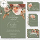 Elevate your wedding day with a touch of bohemian romance with our exquisite boho watercolor floral wedding details card. At the pinnacle of elegance, a delicate spray of terracotta rust and soft peach blush mums, entwined with creamy peach blush roses and accented by verdant sage green eucalyptus and foliage, graces the top of this invitation. Against a serene sage green backdrop, our creamy white text adds a timeless charm, inviting your guests to join in the celebration of your love story. This invitation effortlessly captures the essence of boho chic, setting the stage for a day filled with warmth, joy, and unforgettable moments. Let the beauty of nature intertwine with the elegance of your union, starting with the perfect invitation that speaks to your unique style and vision. Choose our boho watercolor floral wedding design and embark on a journey to a day as enchanting as your love. Created by Simply Farmhouse Press.