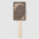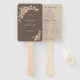 Hand fan program featuring an arch surrounded by peach coloured boho wildflowers on a brown background. Complementary creme colour.