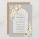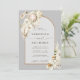 This wedding invitation features painted watercolor protea, white orchids, dry pampas grass, white anthuriums, wildflowers, leaves with an arch frame, and a camel colour background on the back. For more advanced customisation of this design, please click the "customise further" link. Matching items are also available.